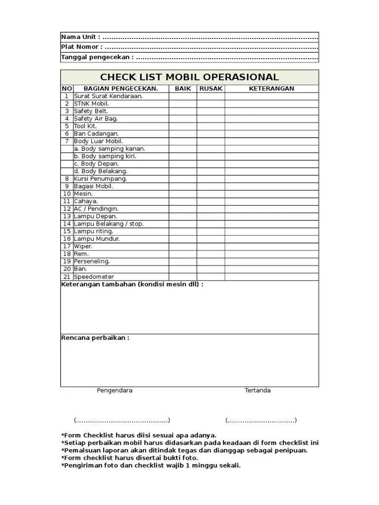 Inilah contoh form checklist kendaraan operasional perusahaan dan informasi lain yang berhubungan dengan topik contoh form checklist kendaraan operasional perusahaan serta peluang bisnis investasi keuangan di website ini. Checklist pemeriksaan mobil jenis/merk mobil : Finden und vergleichen sie to do list excel online. Formulir checklist kendaraan inventaris no. Save save 1.form checklist program harian alat excavator for later.